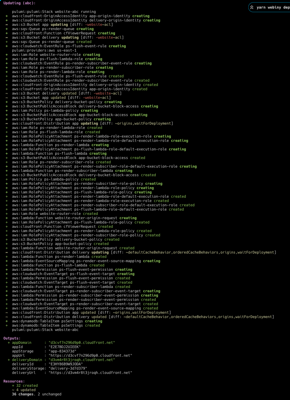 We’ll be doing deployments in an application by application manner. We definitely do not want to just run yarn webiny deploy, as for each application, we want to preview the deployment, analyse the changes Pulumi will perform, and make sure all is in order.